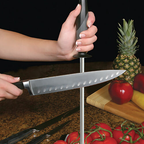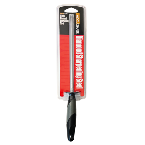 The rubber over-molded handle ensures a safe and secure grip, and the collar guard safely keeps hands out of the way. The AccuSharp® Diamond Sharpening Steel is available in 9 inch length.