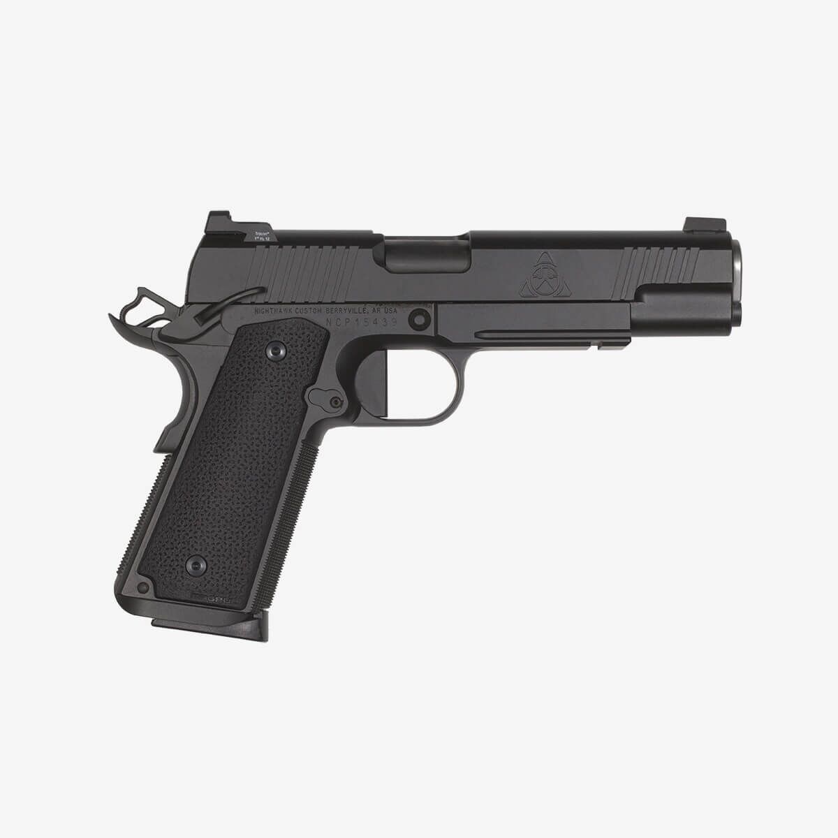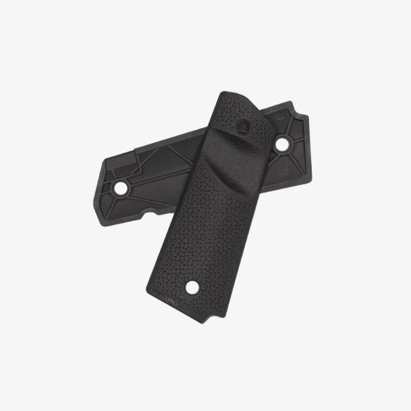 Constructed of heavy-duty reinforced polymer, the grips have a unique diamond-shaped cross section to prevent twisting in the hand, an aggressive magazine release cut-out, aggressive TSP texture (Trapezoidal Surface Projections) for positive control, and are compatible with ambidextrous safeties. The grips are designed to fit full size framed 1911s with standard grip screw bushings.