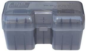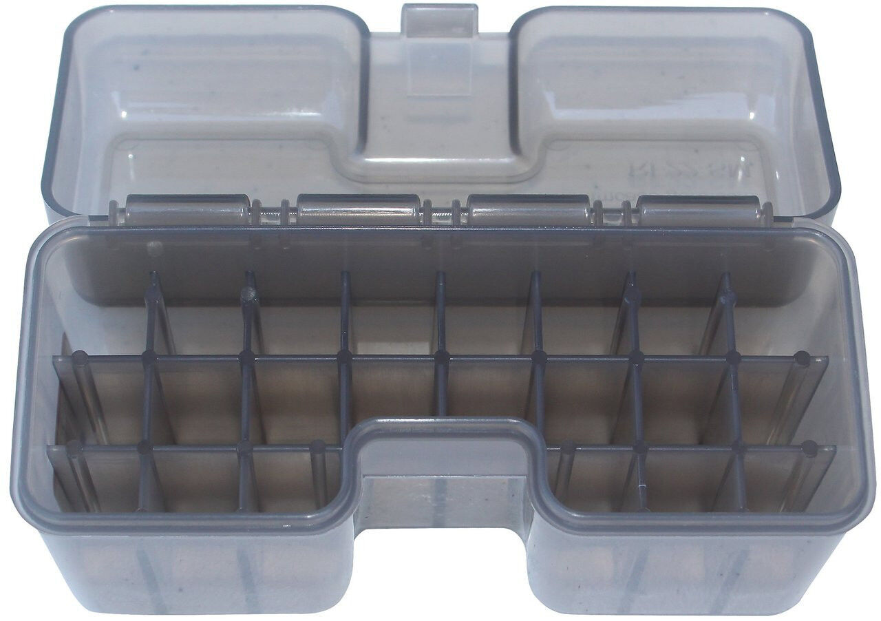 MTM RF22-SM-41 Flip-Top Hinged Ammo Box (Smoke) holds 22 rifle cartridges and protects them from deformation and moisture with a durable, field-ready design. Its living-hinge flip lid and rounded edges make loading and unloading quick and simple, while the translucent smoke finish lets you see contents at a glance. Sized for short magnums and large cartridges — commonly used for rounds like .338 WSM, .45-70 and .450 Marlin — the box accepts cartridges up to Max. OAL = 3.14" (verify your cartridges do not exceed this).