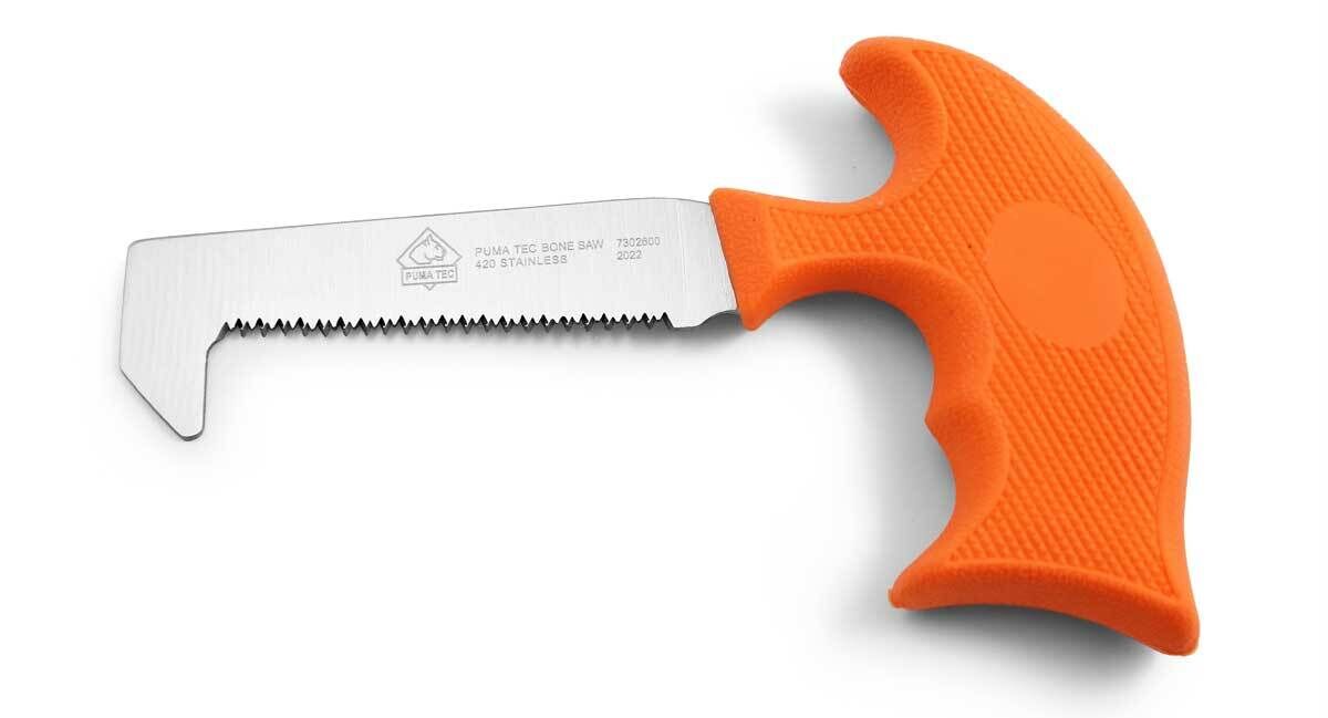 The bone and pry saw is a helpful tool for hunters. The ergonomic and non-slip plastic handle was placed across the saw blade and allows comfortable work when hunting. The rounded tip of the saw blade made of AISI 420 stainless steel prevents damage to organs during sawing. The eye-catching orange color scheme protects against loss in the woods. The scope of delivery includes a black nylon case with belt loop.