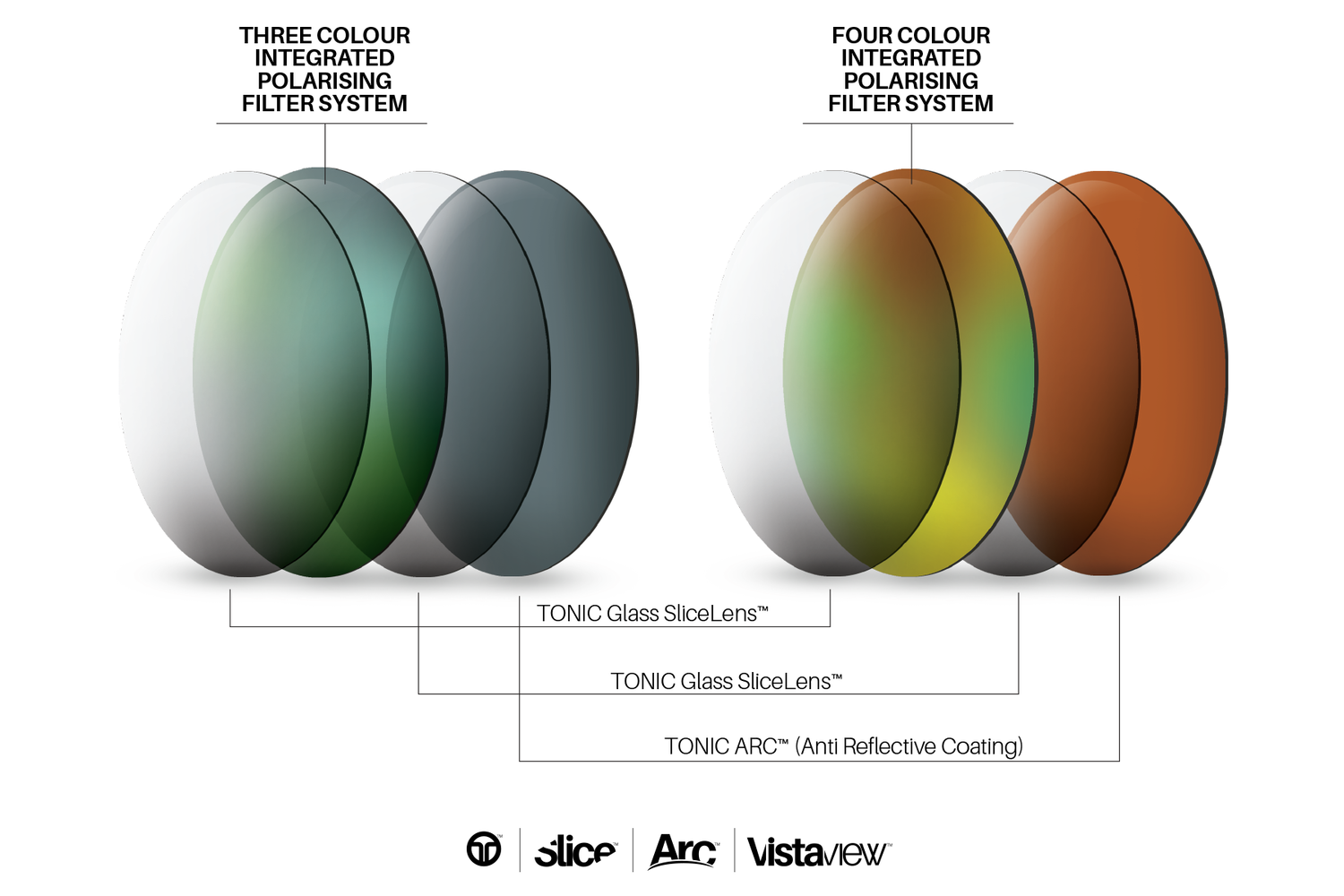 TONIC Polarised Mirror lens incorporates a 4 Colour Integrated Polarising Filter system using the colours: Green - to retain colour, Aqua - that acts as a splitter to define colour where it normally flattens out, and Grey with an additional Yellow - that enhances colour and gives deep contrast.