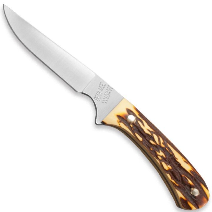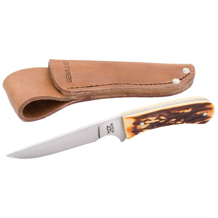 The Bear & Son 6½" Stag Delrin Bird & Trout Knife is a compact and lightweight fixed-blade knife designed for precision tasks such as field dressing small game and fish. Made in the USA, this knife features a high-carbon stainless steel blade with a taper-ground edge, ensuring sharpness and durability. The handle is crafted from Stag Delrin®, offering a comfortable grip and rustic appearance. The knife comes with a brown leather sheath for convenient and secure carrying.